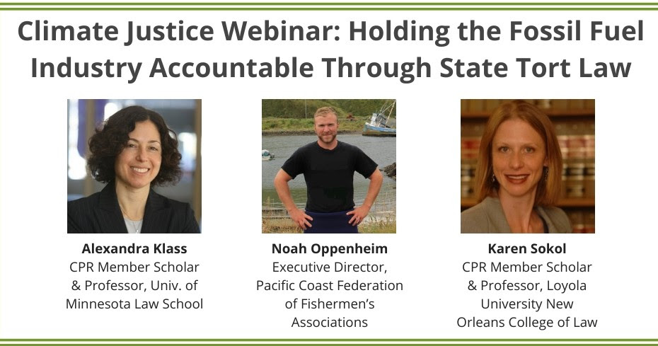 This week the Center for Progressive Reform spotlighted US state tort law’s role in holding the fossil fuel industry accountable for climate change harms. Panelists included Noah Oppenheim of the Pacific Coast Federation of Fishermen’s Associations, Karen Sokol of Loyola University New Orleans College of Law, and Alexandra Klass of the University of Minnesota Law School (my alma mater: Go Golden Gophers). Collectively they describe how this kind of climate change litigation uses run-of-the-mill tort law to hold people responsible for behavior that breaches social norms and harms others. In this way, it can be seen as but one kind of climate change policy tool, along with legislated carbon taxes, tax departments’ renewable energy credit incentives, and international cooperation.